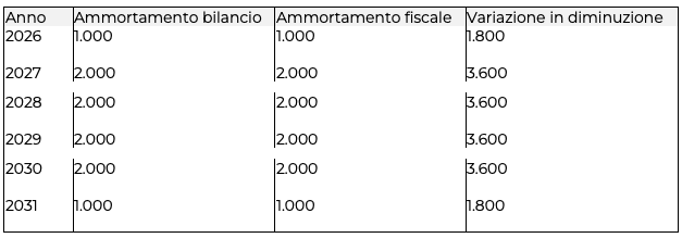 • Ammortamento “aggiuntivo” annuo: 3.600 euro (20% di 18.000) Piano di ammortamento fiscale: